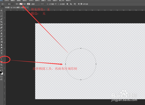 2. 选择【椭圆东西】,再画布中进行绘制椭圆,再菜单栏中设置椭圆参数:填充无,描边无,如图所示