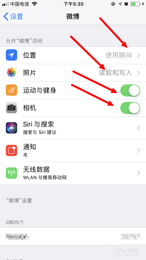 然后,鄙人图的界面中,将位置设置当作利用时代,将照片设置当作读取和写入,将活动与健身以及相机的按钮设置当作打开模式。