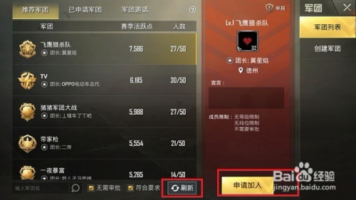 第二步进去军团界面之后,默认保举的军团是合适要求的,但有良多军团需要审批,需要先申请,然后对方赞成才能插手,如下图所示:
