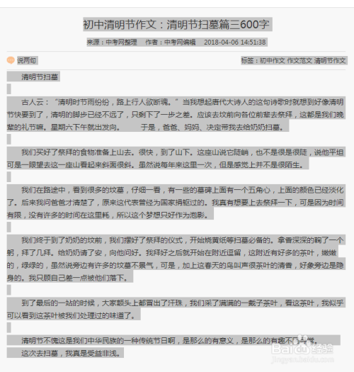 在打开网页上我们看到有很多多少关于清明节的作文的内容,我们可以依次点开看一下。