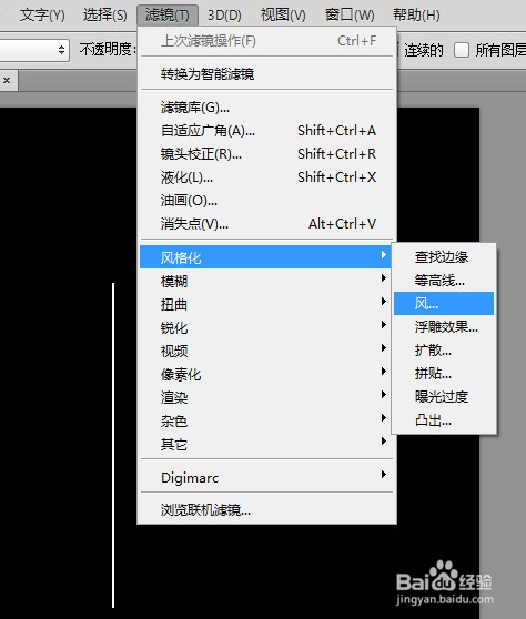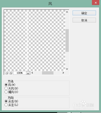 在打开的滤镜窗口中,选中【风】(方式)和【从右】(偏向),再点击确定。
