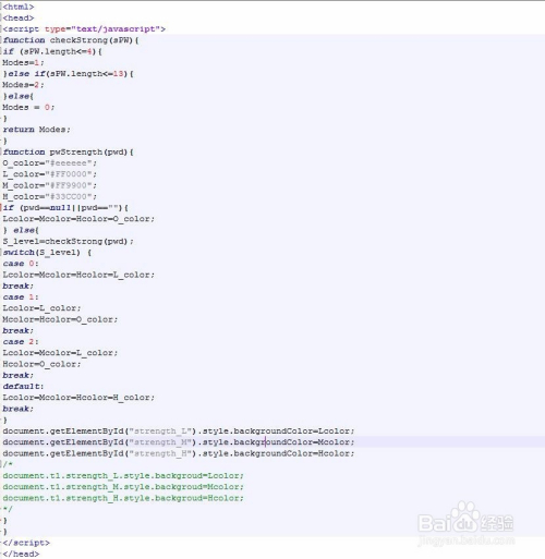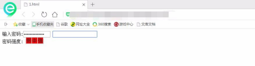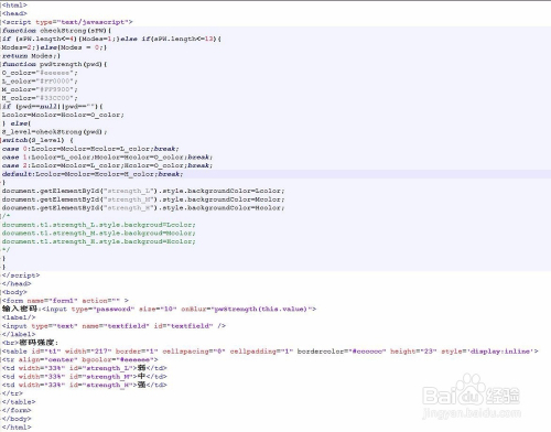 然后写出js判定,在js中本家儿如果判定密码合适哪一种,然后利用case语句进行处置,最后再点窜上面的密码强度的颜色即可