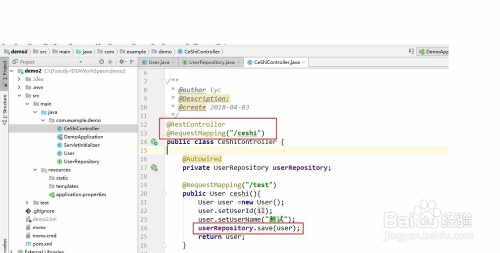 我们在DemoApplication地点的包下成立一个User实体类(就是Bean),这个类对应数据库中的表信息。