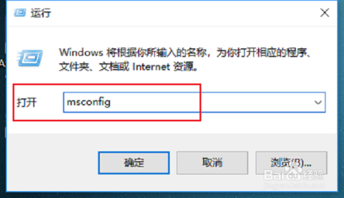 第一步在win10系统上按win+R键打开运行,输入msconfig,点击确定,如下图所示:
