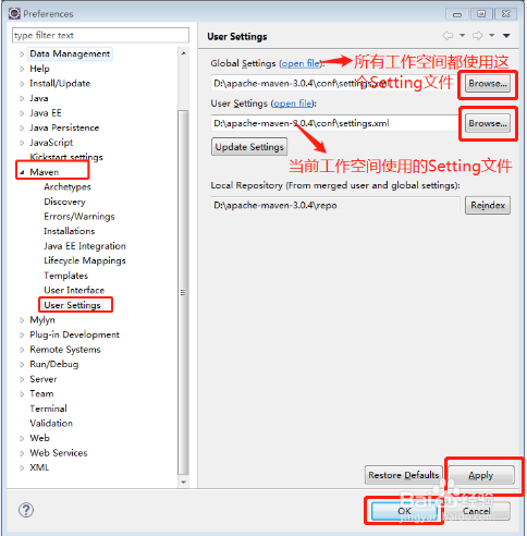 然后点击Maven下的User Setting ,点击Browse,选择上述中的Setting文件,然后点击Apply按钮,在点击OK按钮,至此Maven已设置装备摆设完当作。