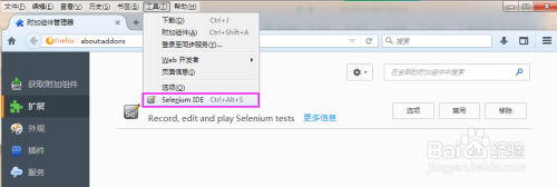 从头打开仗狐浏览器,在菜单栏中可以查看到已经安装的SeleniumIDE。