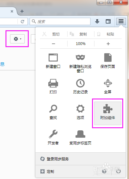打开仗狐浏览器菜单,找到"附加组件"->"设置"。