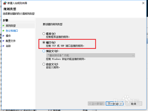 第六步进去新建法则标的目的导界面之后,选择端口,点击下一步,如下图所示: