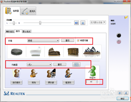 第三步设置扬声器的音效,首先设置情况,一般设置为房间,勾选响度平衡,平衡器设置为无,不要选择现场,风行音乐等,如下图所示: