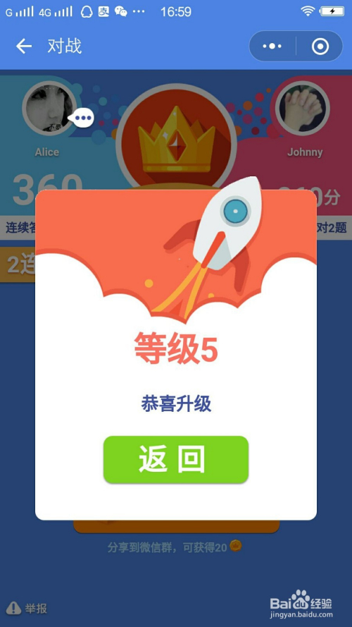6、脑筋王者来袭,当作功竞技品级5。谋事在人当作事在天,当作功与否都看我们的堆集和常识的矫捷运用。所以可以分享成果到微信群,即可继续博得金币。下一步继续挑战。