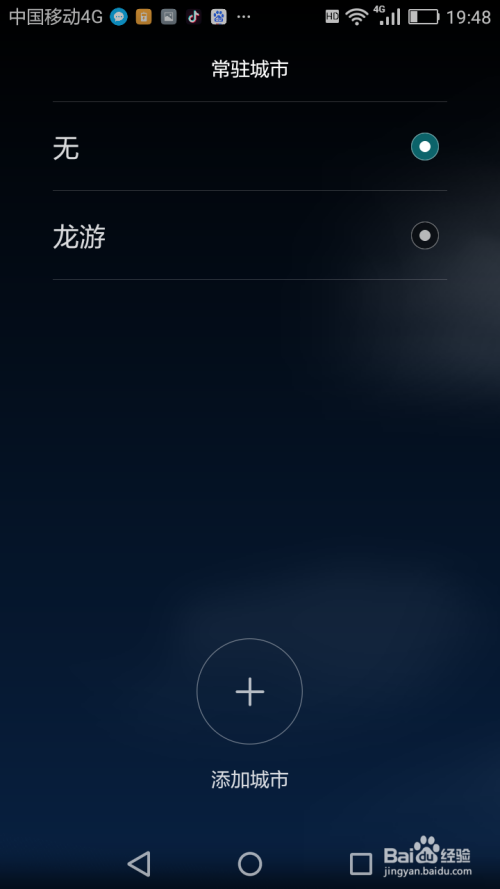 在常驻城市页面点击你地点的城市,若是是两个城市显示也可以添加城市,在手机桌面上会显示两个城市的气候。