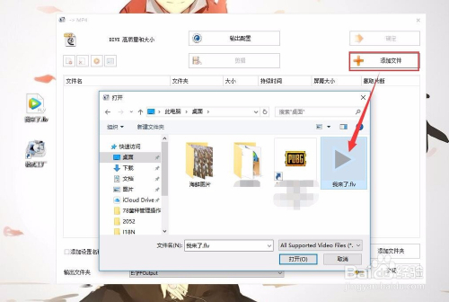点击MP4格局之后就进入了添加视频页面,点击页面上的添加文件按钮,将我们放在电脑桌面上的flv格局视频添加进去。