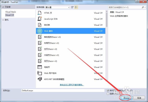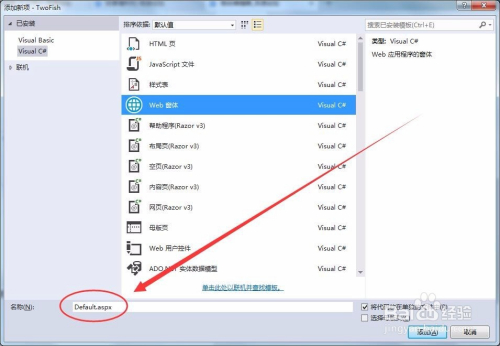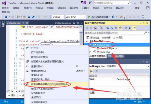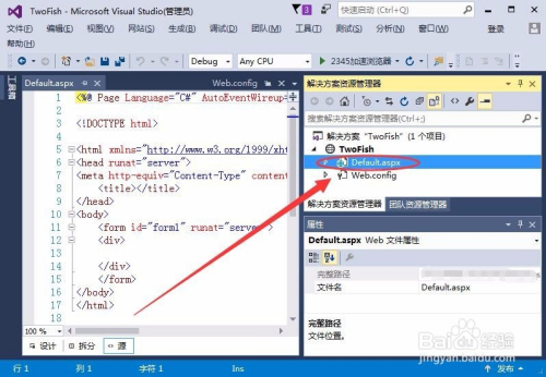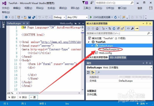 在“解决方案资本办理器”的项目中,可以看到我们添加的页面“Default.aspx”。