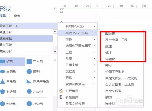 我们点击模具里的更多外形,选择其他visio方案,选择尺寸怀抱—工程选项。