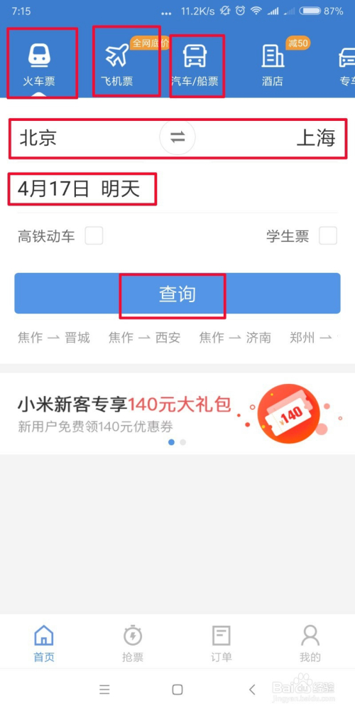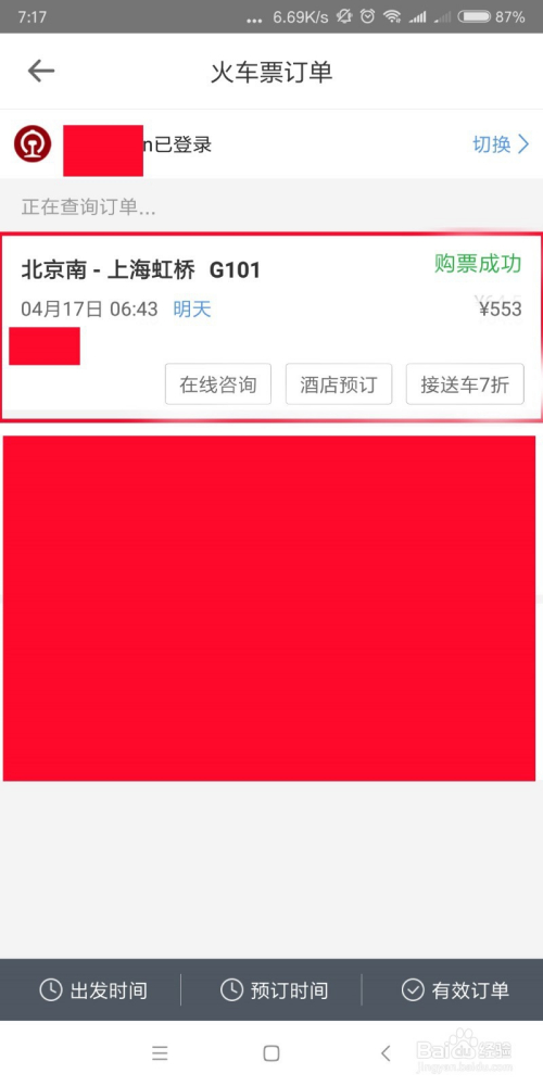 然后在【订单】界面点击【火车票】就可以查看火车票的购票环境了。