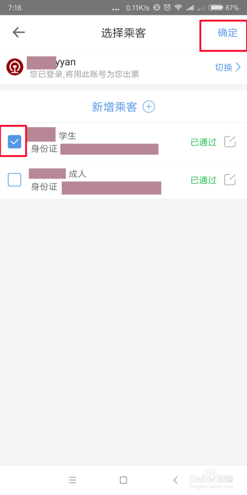 选择【新增乘客】,进去后在购票人前面的方框里打勾,点击【确定】。