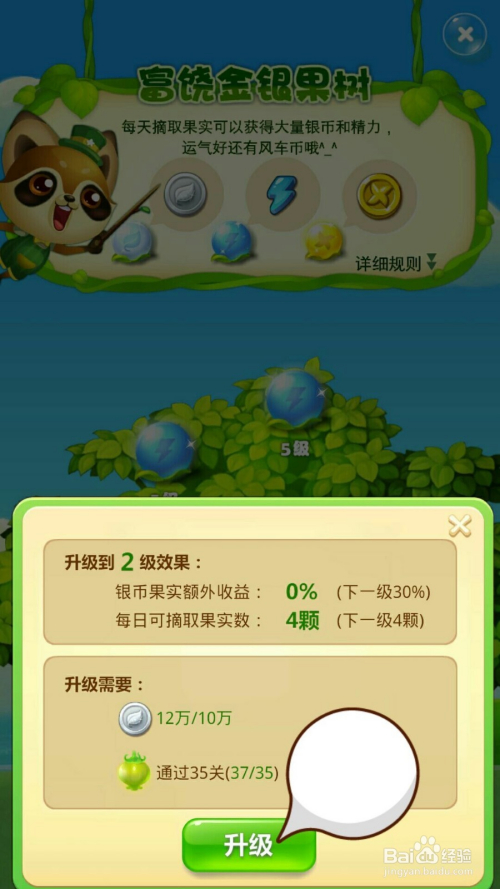 2、从1级升到2级,进级到2级的结果:银币果实额外收益0(下一级)30%,每日可摘取果实数:4颗(下一级4颗)。那么进级所需要:12万/10万银币,要经由过程35关卡(37/35)这就可以点击进级。