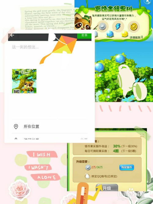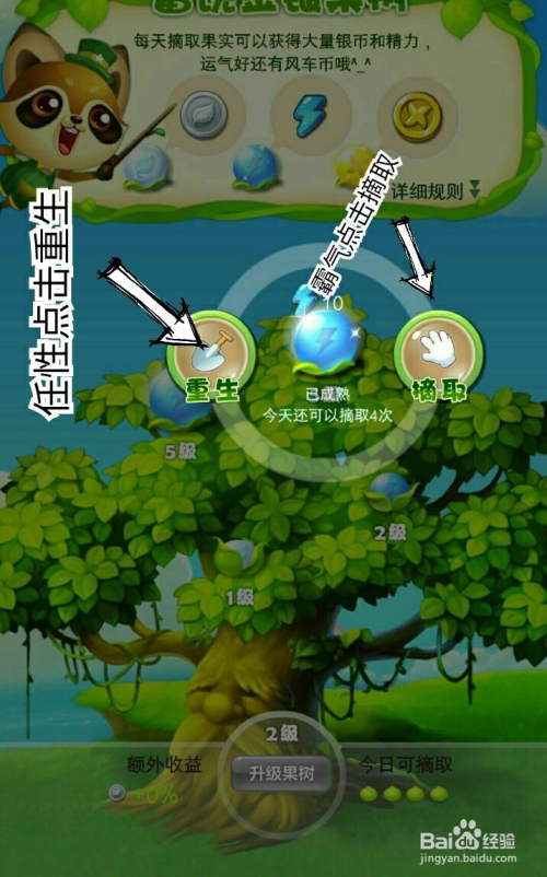 ②每日可摘果实数目:4颗(下一级5颗)③需要银币2万/36万。不敷可以采办银币。④绑定QQ账号就可以升下级啦!