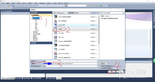 在呈现的对话框里单击【Visual C++】,选择【空项目】,然后输入【名称】,单击【确定】。
