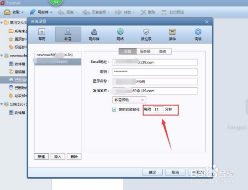输入要收取邮件和发送邮件的邮箱账号和密码后,点击“建立”后,若是输入的准确就会提醒“设置当作功”,我们就会在账号栏左边看到本身新建立的邮箱账号信息。可以设置按时收取邮件时候“这里默认是15分钟”,你也可以设置其他时候频率获取邮箱邮件。