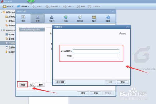 在电脑上安装最新版本的Foxmail客户端,设置添加要收取邮件的邮箱。首先在客户端的右上角设置按钮中,选择账号办理,在账号办理中点击“新建”菜单,弹出添加邮箱账号和密码。