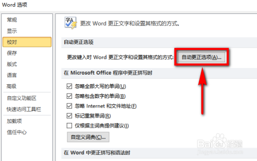 这时就进入到了word选项页面了,在该页面中左侧仍是菜单栏,在菜单栏中点击【校对】选项,如图所示。