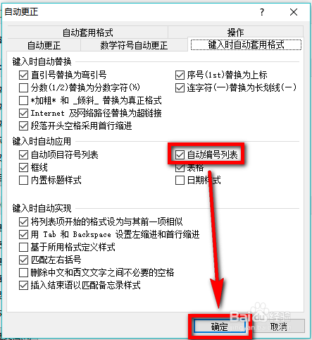 然后在该菜单栏下方的区域中找到建入时主动应用组,在该组别下方点击打消【主动编号列表】前的勾选,然后点击页面最下方的【确定】即可完当作设置,今后word就不会主动进行编号了。