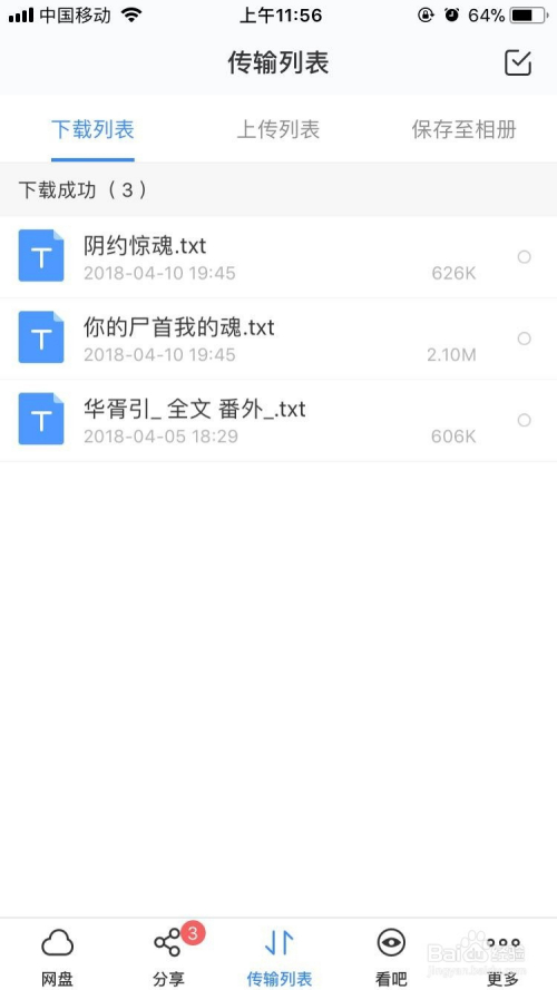在百度网盘中,点击传输列表,下载列表中可以看到小说下载进度。
