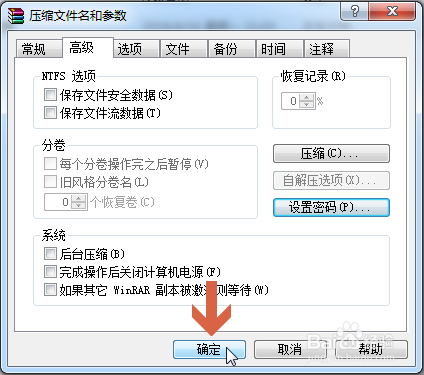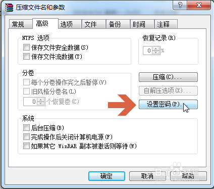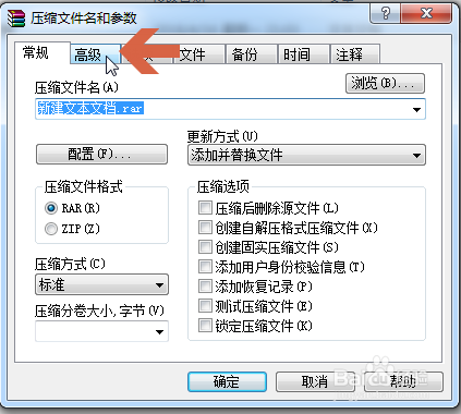 点击后,会弹出压缩文件设置界面,在【压缩文件名处】设置好文件名后,点击【高级】选项卡。
