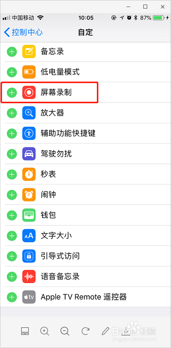 进入“自定控制”页面后,标的目的上滑脱手机屏幕,找到“屏幕录制”,单击“屏幕录制”前面的加号,然后把手机屏幕滑到最上面,发现“屏幕录制”前面有个减号,申明添加当作功。