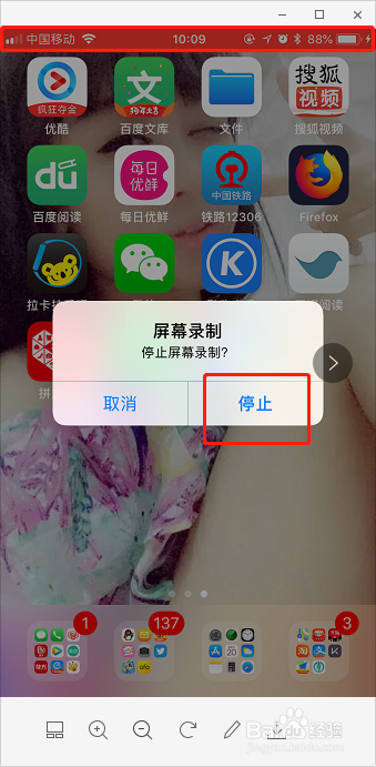 屏幕录制完当作后,点击手机最上面红色区域,会提醒是否遏制屏幕录制,然后点击“遏制”按钮。