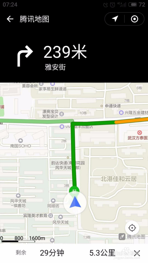 第十步:点击导航后将进入如下图所示的导航界面,此时微信导航小法式将贴心地为我们导航,告诉我们怎么前去目标地、还显示路况、残剩距离和时长等信息。