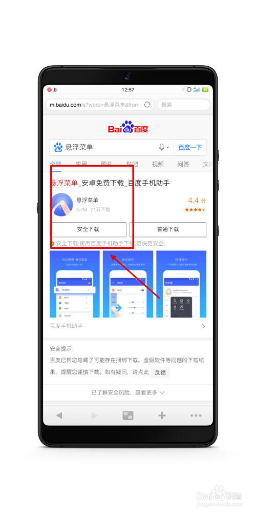 打开手机自带的浏览器,打开百度首页,在搜索框内输入"悬浮菜单",在搜刮成果中,点击软件下方的通俗下载,下载完毕后,安装悬浮菜单的软件。
