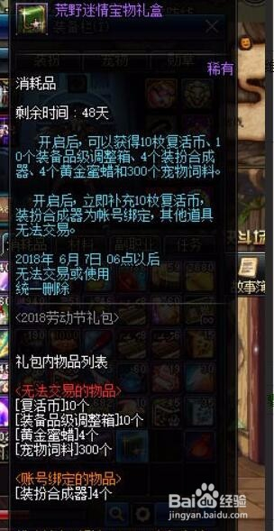 第五个物品,赠品礼盒,采办268礼包会有赠品礼盒,荒原迷情宝贝礼盒,开启可以获得10个新生币,10个装备等第调整箱,4个装扮合当作器,4个黄金蜜蜡和300个宠物饲料。根基都没啥用。