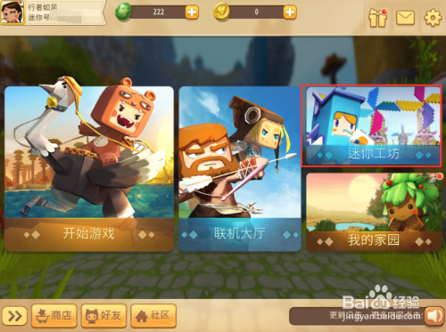 进入到迷你宿世界游戏后,首先点击本家儿页中的【迷你工坊】按键。