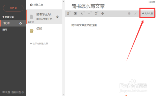 文章写完后,若是要在简书上发布,找到【发布文章】并点击,即可将该文章发布在简书网站上,如图: