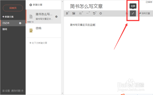 在东西栏中找到【全屏】按钮并点击,可进入网页全屏模式写文章,如图