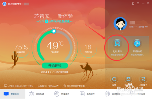 我们打开联想电脑管家之后,我们在联想电脑管家页面找到‘礼包集市 ’按钮,点击打开礼包集市页面 。
