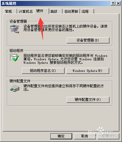 在系统属性页面内,我们点击上方的“硬件”选项卡。