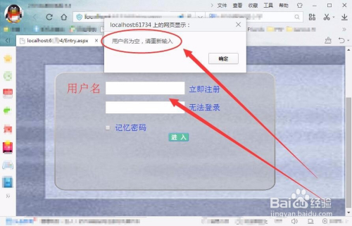 浏览网页,当用户名为空时,单击进入按钮,网页中就会提醒从头输入用户名。