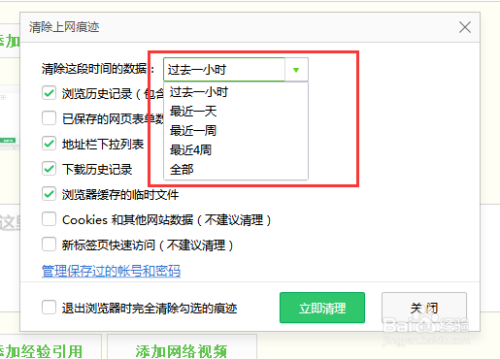 在清理陈迹窗口中选择需要时候段,或者选择全数