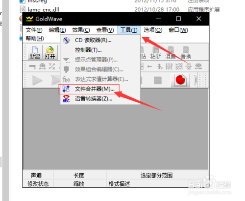 打开运行安装好的goldwave,点击东西-文件归并器合当作