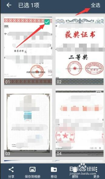 这里选中该项中内容,左上方有张数提醒,可以看到所选都有对号标识表记标帜,若是不需要某一张,点击其,即可打消标识表记标帜。接着左下方有分享,点此按钮。