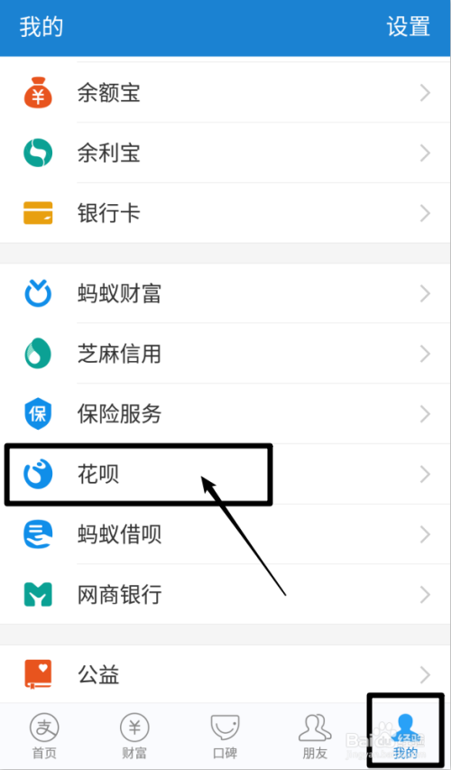 首先我们打开付出宝,点击【我的】,往下滑动找到【花呗】点击进去
