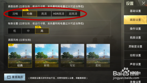 在最上面是画面品质设置,分为流利、平衡、高清、HDR高清、超高清几种,调整的原则是,包管画面不卡,流利性好的前提下,画质尽量高,一般高清就够用,如图所示。