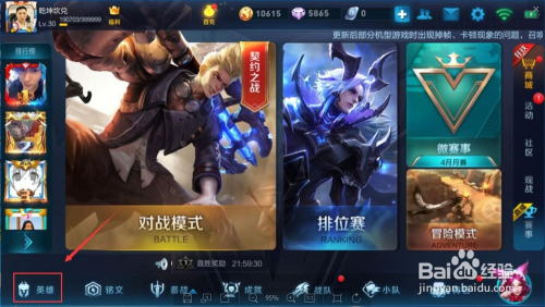 首先,我们登录王者荣耀手旅客户端,进入到游戏年夜厅界面。点击菜单"英雄",找到英雄白起点开。