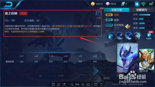 打开英雄介绍页面,我们可以看到白起的英雄模子,和对应的各类皮肤模子。点击英雄的根本,可以看到白起的初始移动速度是390,根本物理防御98,神通防御50.移动速度相对较快。在初始团战时,粘住敌方长途英雄根基很难逃失落。