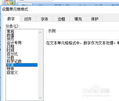 选择数字选项卡,在分类中选择文本
