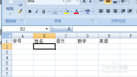 按tab键,选择B1单位格,输入姓名。在C1 D1E1中输入语文 数学和英语
