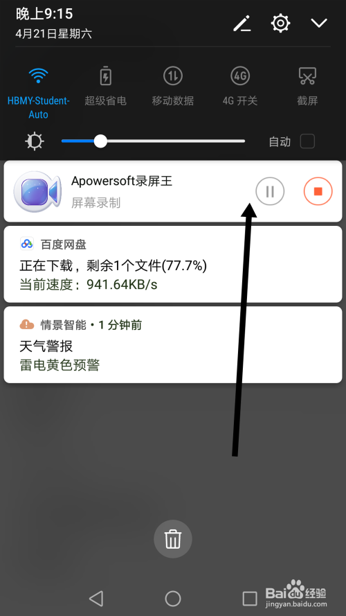 在录屏完当作后,拉下使命栏,你会看到录屏进行中,点击右侧的竣事,那么你的视频就录完了。